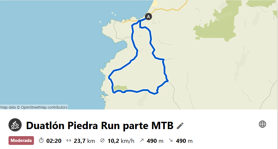 La etapa de MTB empieza y termina en la Cafetería Piedra Run. Cuando el ciclista llega a la cafetería Piedra Run, deja su bicicleta y sigue corriendo a pie bajando a la playa de Mar Brava, donde corren 2,5 km de ida y 2,5 km de vuelta, volviendo a la meta.